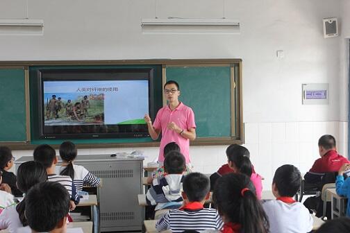 的志愿者朱冬兰为小学生们带来了纺织工艺的重要流程——印染的基础知识,并用生动的语言讲解了一块布从白色到染上五颜六色,并赋予这块布各种特性的过程。在讲课的同时,朱冬兰还准备了多款纺织布料样品,通过摸一摸、看一看、猜一猜等方式,让学生们真切感受到在现代纺织科技下,新型印染面料产品的各种特点、用途以及价值,为整堂科普课带来了活跃的气氛。
