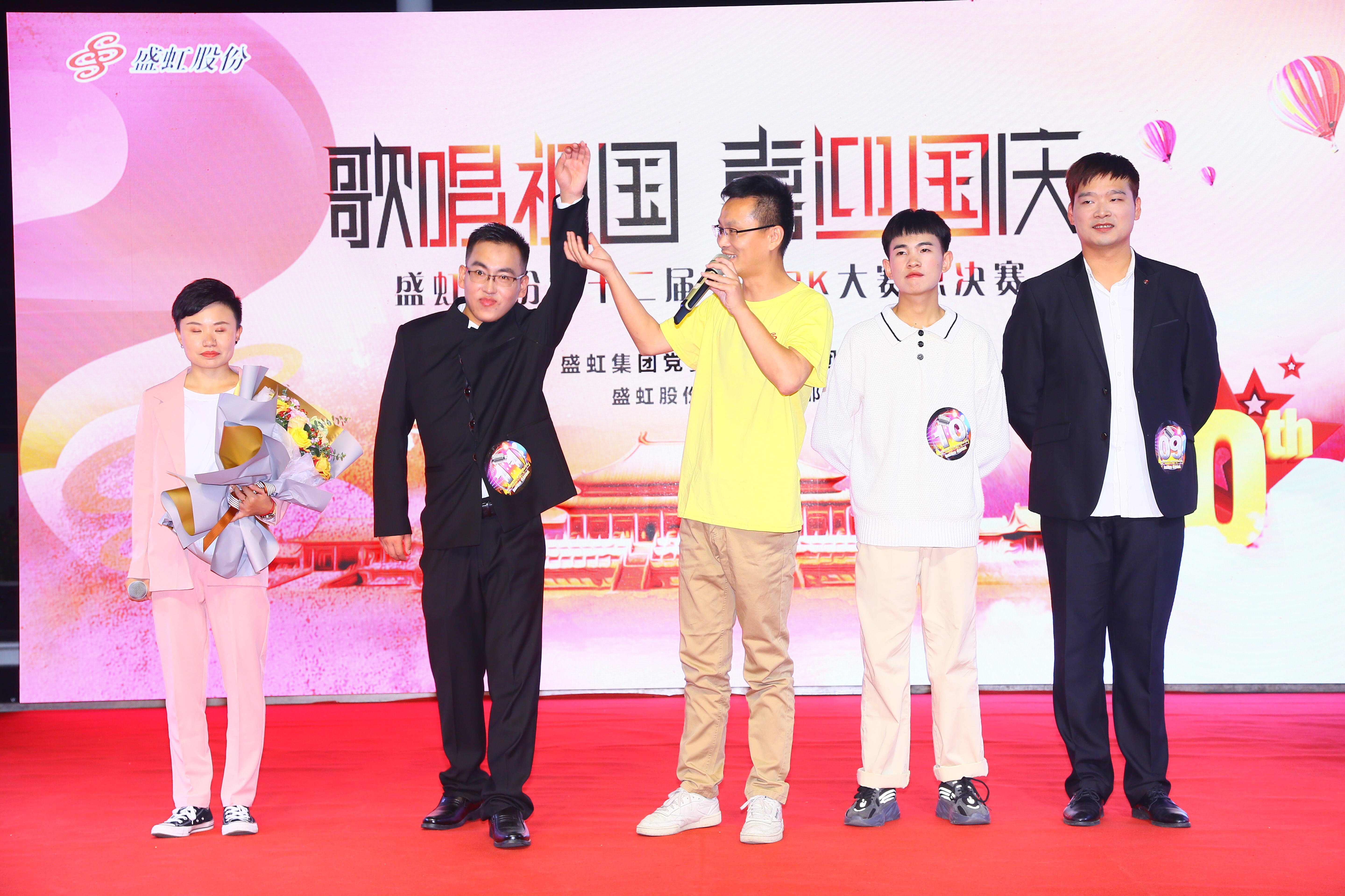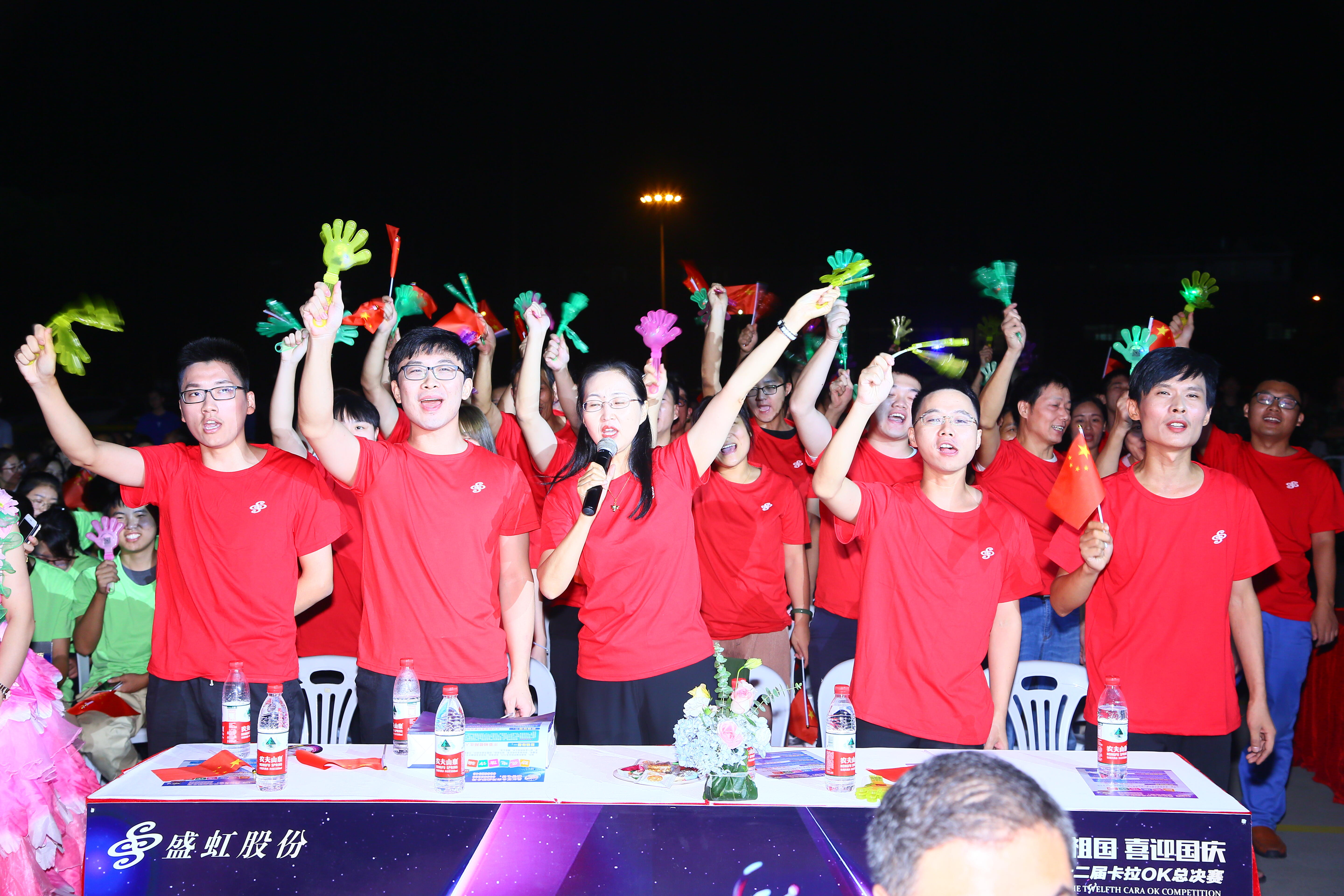 红歌大赛在《我和我的祖国》中拉开帷幕。经过两个月的时间,从近千名选手中遴选出的17位选手分为四大战队进行“PK”,同唱祖国赞歌。《歌唱祖国》、《映山红》、《龙的传人》、《我的中国心》……一首首脍炙人口的歌曲,传递着盛虹人对祖国的祝福。员工们手握红旗、胸口贴上心形贴,在激昂的歌声中,晚会现场俨然一片红色的欢乐海洋。