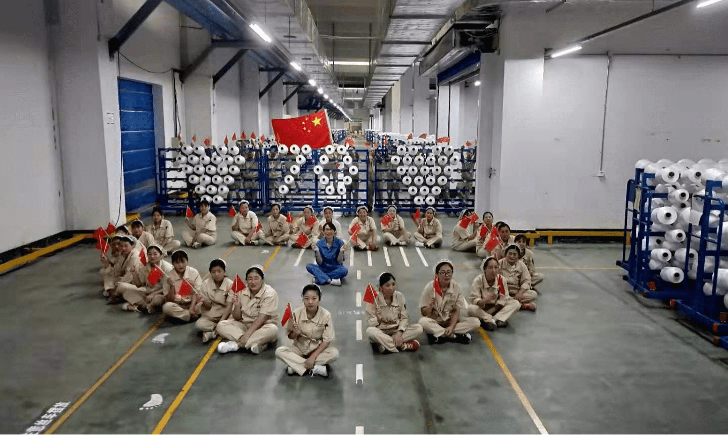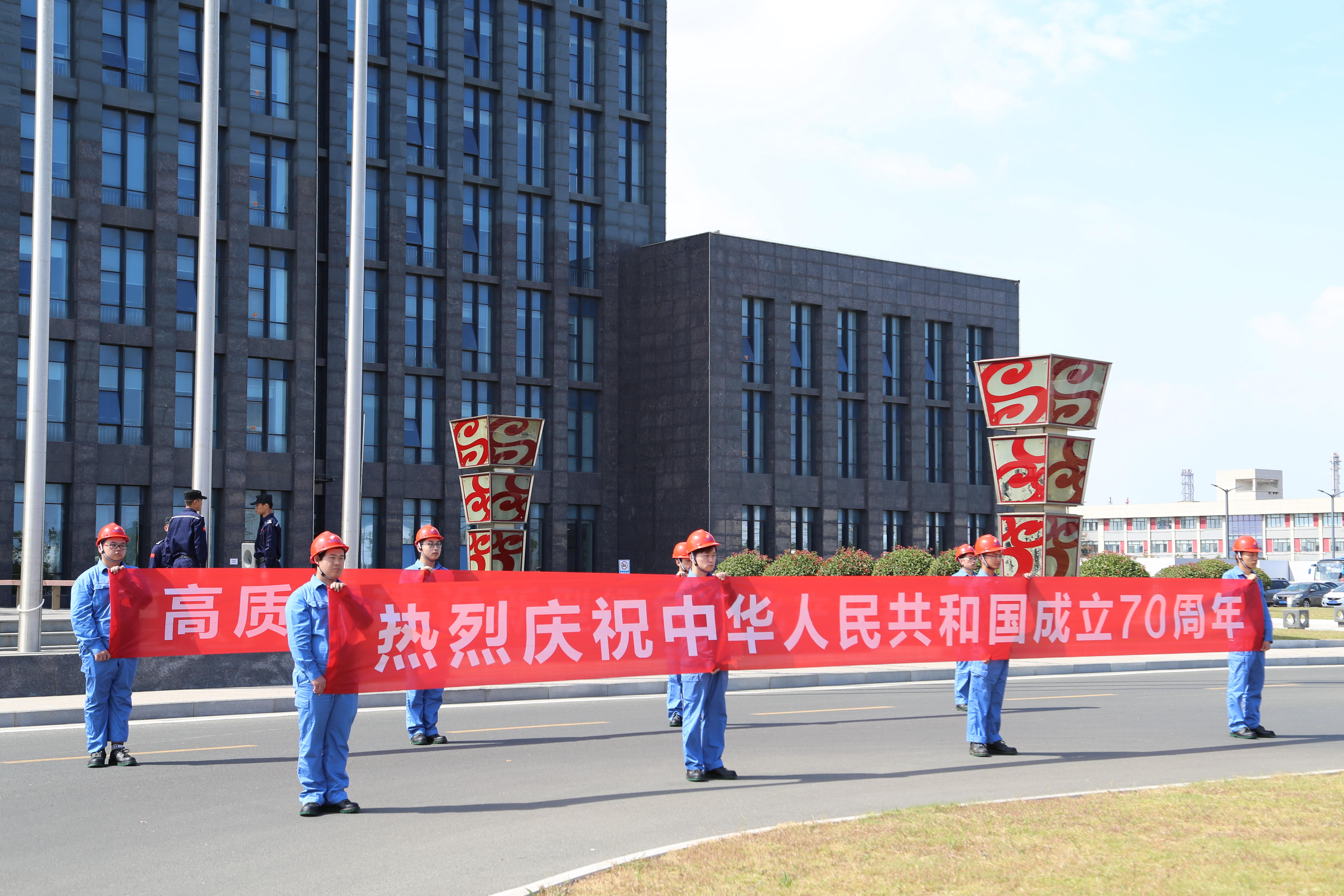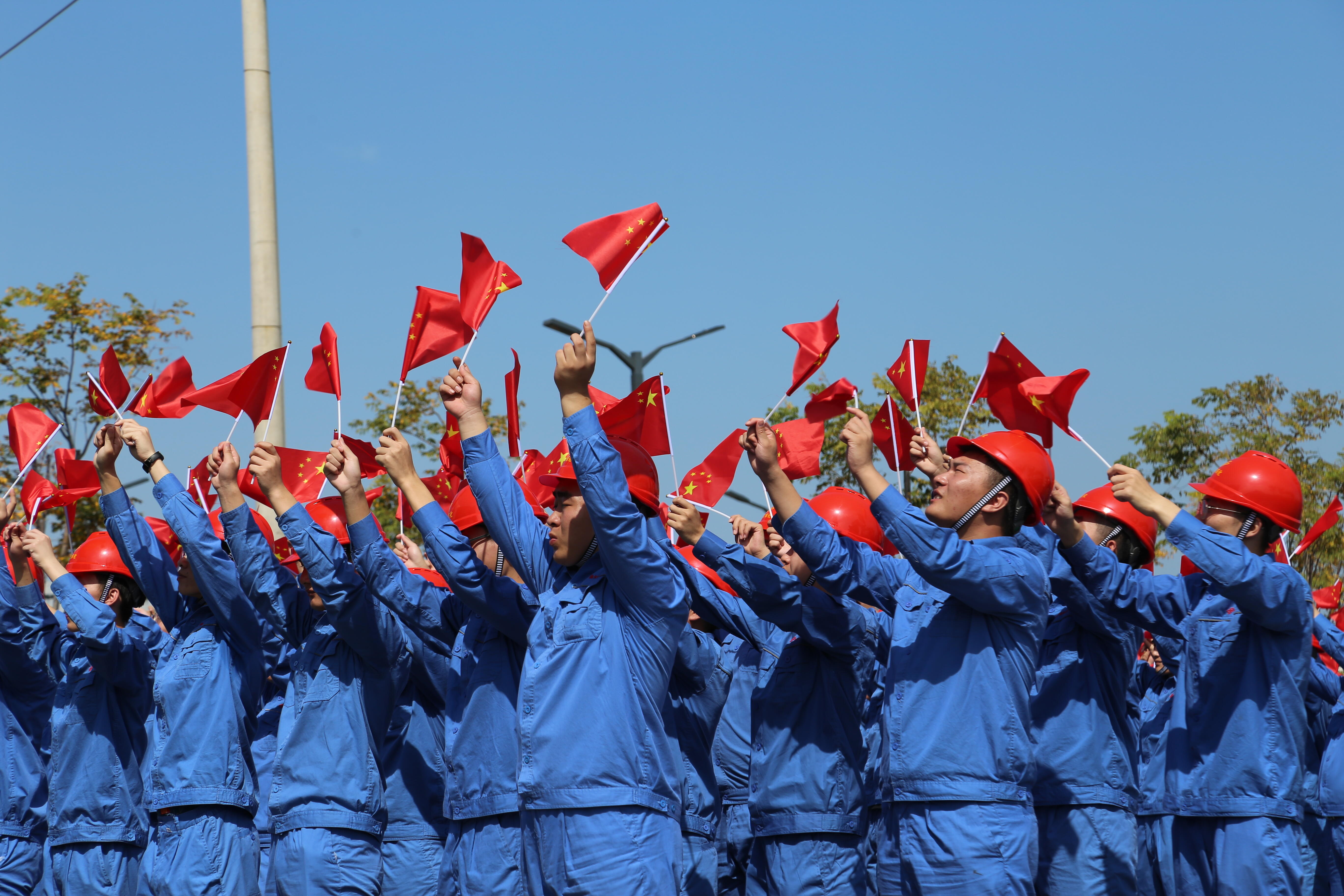在连云港的盛虹石化产业园区,则上演了一场“我和我的祖国快闪活动”。升国旗、唱国歌,超过200名青年员工更自发组成“70”字样,在1600万吨炼化一体化项目建设工地上,以快闪的形式表达对伟大祖国的祝福。