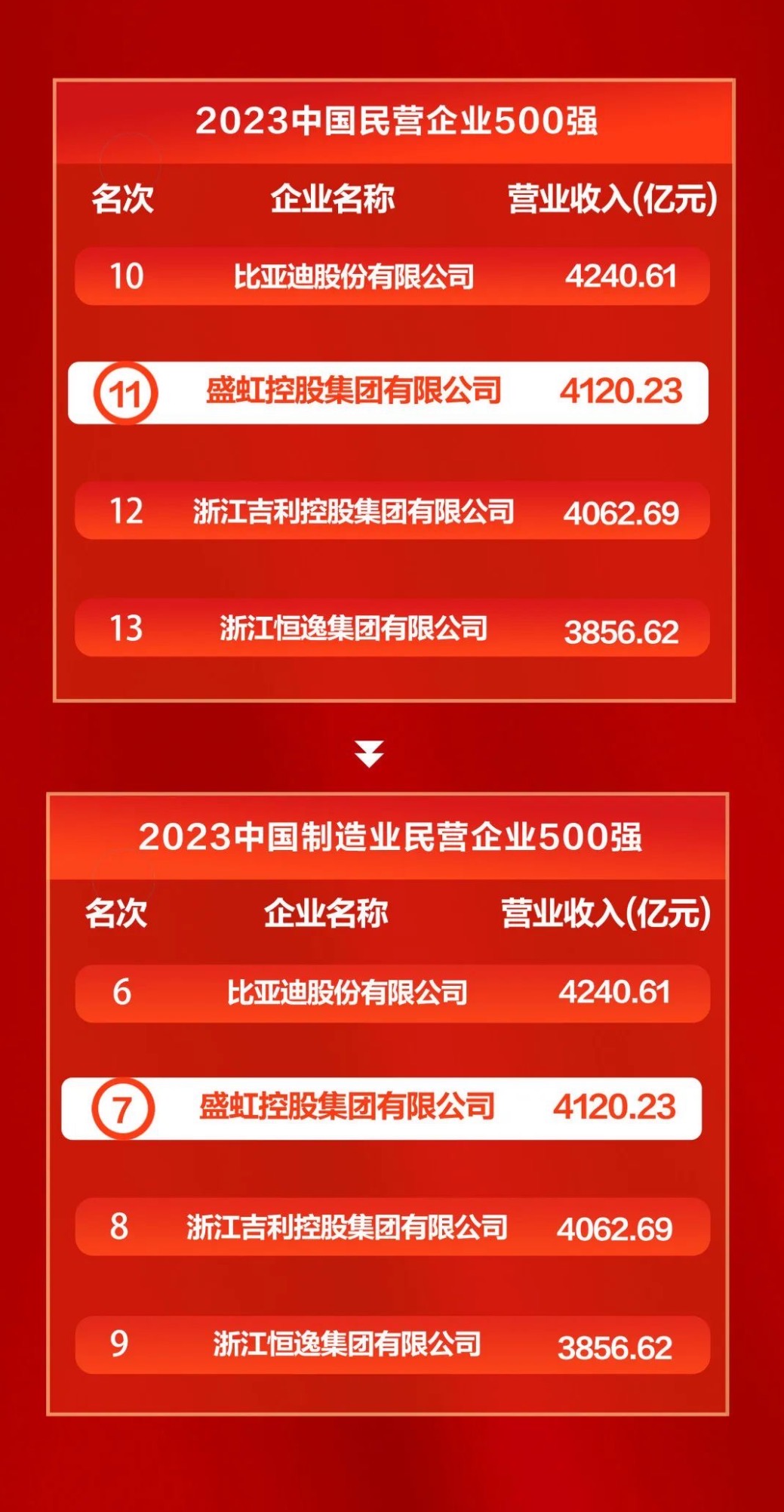 位列中国民营企业500强第11位,中国制造业民营企业500强第7位,以高质量发展的姿态稳居中国民营企业前列!